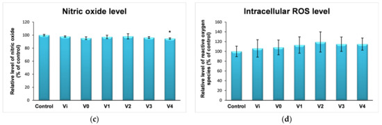 Cellular response revealed by the cell viability (a), LDH (b), and NO (c) release as well as intracellular ROS level (d) after 24 h exposure of human keratinocytes to PUF-derived conditioned media. Results were calculated as the mean ± standard deviation (SD) (n = 3) and represented relative to the control (untreated cells). * p < 0.05 and ** p < 0.01 compared to control.