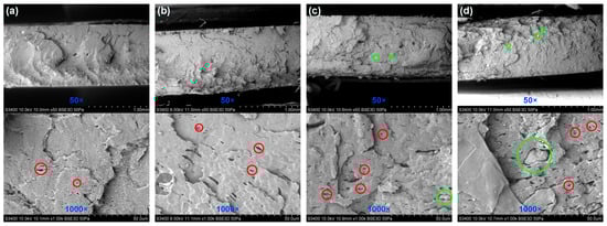 SEM images of a fractured surface of the BE-PLA-FG nanocomposite: (a) 1 wt.%, (b) 5 wt.%, (c) 10 wt.%, (d) 15 wt.%. Red circles show examples of voids, while green circles show examples of possible agglomerates.