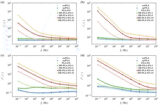 The dielectric behavior of BE-PLA-FG nanocomposites and three samples without the addition of nanofillers (uuPLA, upPLA, PLA-FG) are presented in Figure 2. The dielectric constant and dielectric loss of all studied samples were investigated in terms of the wide frequency range, and temperature. The representative results of these studies are presented in Figure 2, where the real and imaginary parts of permittivity spectra at 293.15 and 333.15 K (20 and 60 °C) can be observed. As it can be seen, (Figure 2a,b) of samples without the addition of bentonite (upPLA, PLA-FG) remain almost insensitive to frequency changes, and the shape of their spectra is close to pristine PLA (uuPLA), as reported in [,,]. The increase in temperature causes a slight increase in values of the dielectric constant (Figure 2a,b). On the other hand, there are visible differences in the dielectric loss of PLA-FG and polylactide without any additions (uuPLA and upPLA) (Figure 2c), which decreases with increasing temperature (Figure 2d).