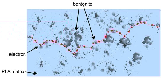 A diagram of the phenomenon of electrical conduction by tunneling is marked on the nanocomposite cross-section. The light blue color indicates the PLA matrix, the gray non-regular elements represent dispersed particles, the red dots show electrons, and the red dashed line shows the possible tunneling path of the charge carrier through the volume of the nanocomposite.