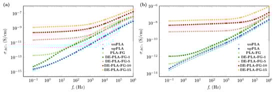 The addition of bentonite to polylactide has also impacted its AC electrical conductivity. Evidence of these is presented in Figure 4, where the conductivity spectra of BE-PLA-FG nanocomposites and three unfilled samples at two representative temperatures 293.15 K (20 °C) and 333.15 K (60 °C) were presented. As was previously stated, the injection process of pristine PLA does not significantly affect its electrical conductivity, especially at lower temperatures of 293.15 K (20 °C, as shown in Figure 4a). Only at higher temperatures of 333.15 K (60 °C, as shown in Figure 4b), can slightly higher values of electrical conductivity be noted in the entire frequency range. This slight increase in the value of was stamped out by the rise in lactic acid content that resulted from hydrolysis and degradation in higher temperatures. Meanwhile, the addition of glycerine and Fusabond to the polylactide resulted in an increase in electrical conductivity throughout the whole tested frequency range, which may be due to the concentration of hydronium cations increased overall []. Additionally, unfilled samples exhibit strong frequency dependences of AC conductivity that are observed in the case of electroinsulating materials []. In contrast, samples containing a load of bentonite show regions where values of electrical conductivity of nanocomposites are almost unaffected by frequency changes (plateau). This behavior is observed in the low-frequency range, and the span of its occurrence increases as the filler content increases. After the plateau, a rapid increase in electrical conductivity is observed with increasing frequency. Such behavior is in agreement with universal power law expressed as follows []