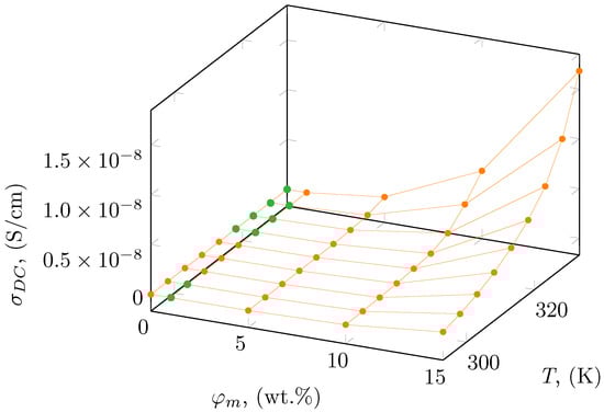 where A and n are numerical factors and is DC electrical conductivity, while means angular frequency. Similar electrical conductivity spectra were previously observed for various types of nanocomposites filled with different types of nanoparticles [,,,,,].