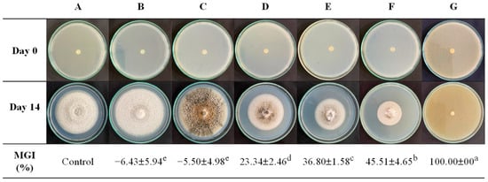 The in vitro antifungal activity of the coating solution was evaluated using PDA amended with different concentrations of the coating solution. A 7 mm diameter agar plug from the margin of a 14-day-old pure culture of C. gloeosporioides was transferred to the center of each PDA plate supplemented with the desired concentration of GRS/CS coating solution (100:0, 70:30, 50:50, 30:70, 0:100 (% mol)). PDA plates containing 0.1% v/v aqueous acetic acid solution (pH 5.6) served as the negative control. Three replicates of each coating solution were prepared. All plates were then incubated at room temperature for 14 days, and the radial mycelial growth was measured daily in two perpendicular directions. The results are expressed as the percentage of mycelial growth inhibition (MGI), calculated using Equation (1), where Dc represents the colony diameter in the control plate and Ds represents the colony diameter in the PDA supplemented with a coating solution.