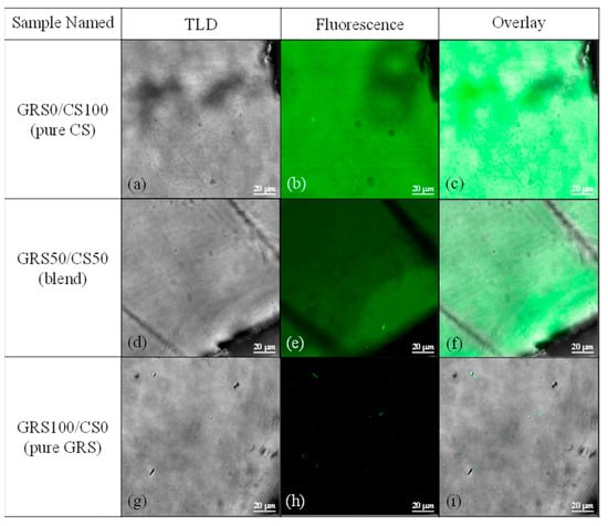 Microscope images of pure chitosan (a–c), pure GRS (g–i), and the GRS50/CS50 blend film (d,e,f). The sample films’ top surfaces captured at 63x magnification, scale bar: 20 µm, using different modes: Transmitted Light Detector (TLD) (a,d,g), fluorescence (b,e,h), and an overlay of TLD and fluorescence (c,f,i).