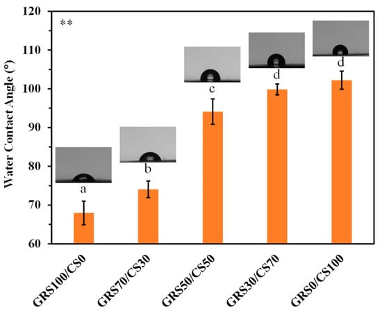 The water contact angles provide insight into the influence of the polymer composition on the hydrophobicity of GRS/CS composite films, shown in Figure 4. The pure GRS film displays high hydrophilicity, characterized by a low contact angle of 68°, primarily attributed to the abundance of hydroxyl groups in starch. This hydrophilic nature of starch coatings predisposes them to water absorption, potentially enhancing moisture permeation, which could accelerate spoilage []. Furthermore, when using starch films under high-humidity atmospheres, such as coatings for fruits and vegetables, the heightened hydrophilicity may elevate gas permeability, thereby impacting gas-exchange dynamics and influencing the produce deterioration rate []. Consequently, the hydrophilic GRS film is considered unsuitable for applications as coatings to extend the shelf life of post-harvest produce.
