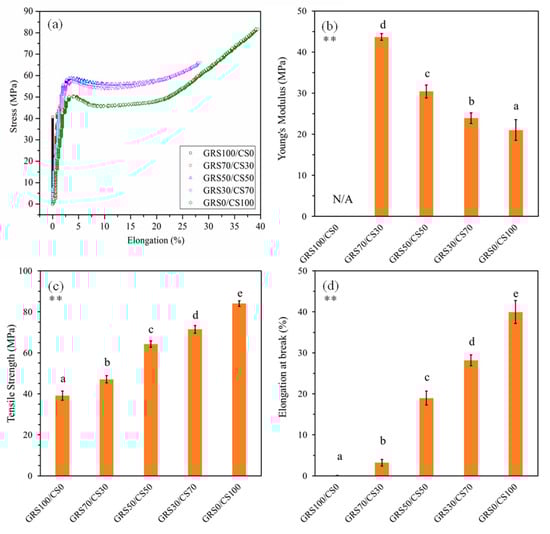 Stress–strain curves (a), Young’s modulus (b), tensile strength (c), and elongation at break (d) of the GRS/CS blend films with different molar proportions. Footnote: ** p ≤ 0.01 differences are highly significant, different letters above the bars indicate statistically significant difference.