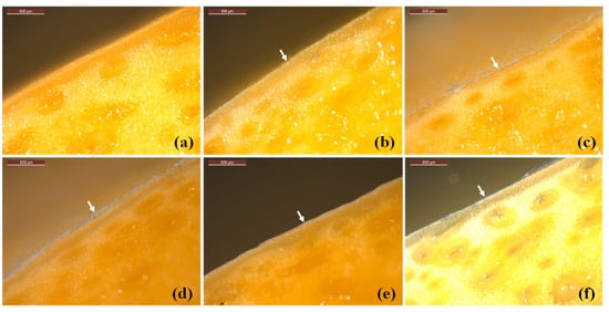 Optical stereo microscope images of cross-sections: film free mango surface (a), and the mango surfaces coated with GRS100/CS0 (b), GRS70/CS30 (c), GRS50/CS50 (d), GRS30/CS70 (e), and GRS0/CS100 (f). The scale bar is 500 µm. The white arrow indicates the GRS/CS film coated on the mango surface.
