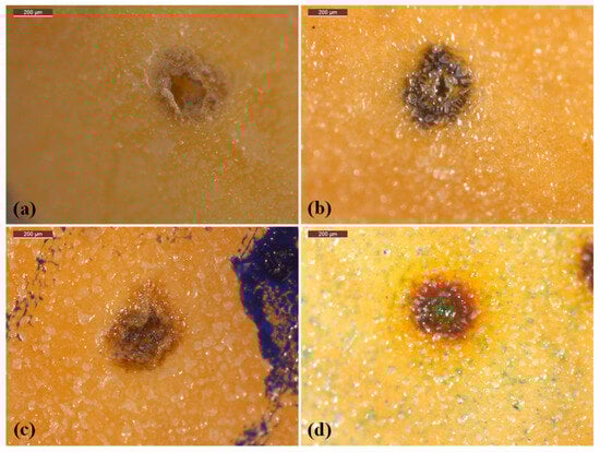 The experimental findings align with previous studies on the efficacy of polymer film coatings on mango lenticels. Figure 7a illustrates the lenticels on the free surface of mangoes, revealing varied performances of polymer coatings in covering these structures. This divergence can be attributed to the hydrophobicity and viscosity of the polymer solutions. The GRS coating, characterized by low viscosity and high hydrophilicity, only partially covers the lenticels, as depicted in Figure 7b. Consequently, the pure GRS film proves inadequate in effectively controlling gas and water vapor diffusion, failing to delay produce ripening and to reduce shriveling. In contrast, the hydrophobic nature of chitosan enables effective coverage of mango lenticels, as depicted in Figure 7d.
