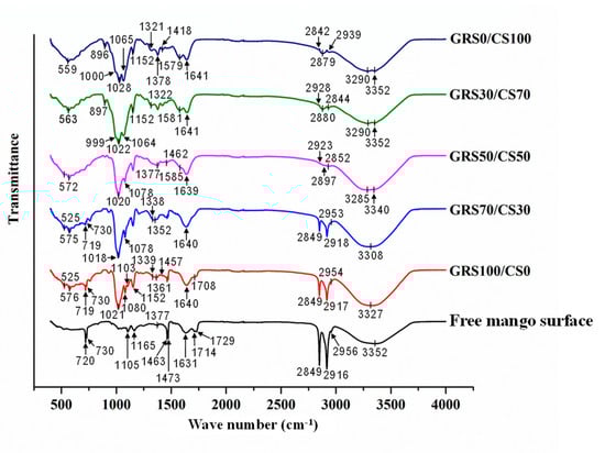 This study effectively utilized ATR-FTIR spectroscopy to assess the efficiency and effectiveness of polymer film coatings on produce or food surfaces, offering a valuable analytical tool within food science and technology. By employing FTIR spectroscopy, we gained insights into the chemical composition, molecular structure, and interaction of the polymer film with the surface of the produce or food. Our findings underscore the potential of FTIR spectroscopy as an effective method applicable to various food and product-related analyses. Figure 8 shows the FTIR spectra of the pure polymers and GRS/CS blended polymer films with different molar compositions coated on mango surface compared to the spectra of uncoated mango surface. The characterization of uncoated mango surface by FTIR spectroscopy has provided significant information on the nature of functional groups present in the cuticle matrix.