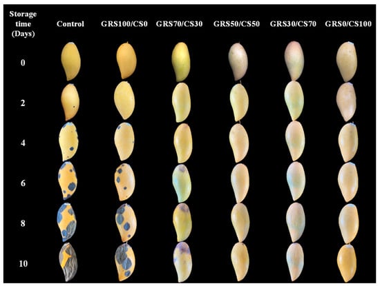 The appearances of mangoes without and with the experimental GRS/CS coatings during storage at room temperature for 10 days.