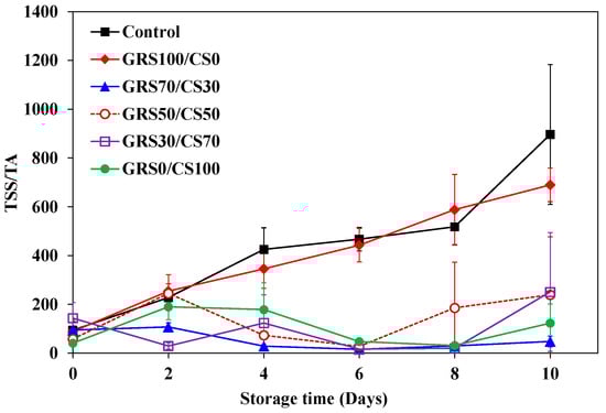 Mango samples, treated with film coatings having various GRS/CS ratios, were stored at room temperature for 10 days, with monitoring of physical appearance and TSS/TA every 2 days (Figure 9). Initially, all the samples exhibited firm skin without disease symptoms. The control and GRS100/CS0 samples developed significant anthracnose symptoms, expressed as dark, sunken lesions on days 2 and 4, respectively, consistent with observations by Hadthamard et al. [] of uncoated samples. The GRS70/CS30 showed symptoms of stem end rot on day 6. These post-harvest diseases typically manifest several days after fruit collection, significantly influencing consumer decisions. This study affirms that coating with chitosan mole fraction from 50% up effectively prevents disease throughout storage. These findings align with previous observations, indicating enhanced inhibition of Colletotrichum spp. with increasing chitosan proportions. All GRS-CS treatments satisfactorily reduced dehydration and delayed mango ripening. Coated samples demonstrated less shriveling and color change than the control samples, attributed to the hydrophobicity of chitosan (high contact angle), which effectively covered lenticels and limited water migration. The primary function of the coating material is to reduce moisture and gas permeation between fruit and its environment, resulting in lower respiration rates, reduced water migration, and delayed ripening [].