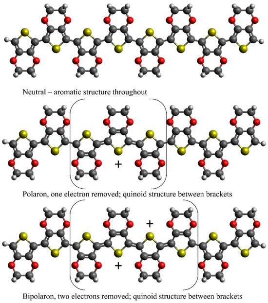 Thiophene derivatives including PEDOT have three carbon–carbon bonds in each monomer unit, and so bond inversion is not energetically neutral. A neutral PEDOT monomer unit has a long central bond and a shorter bond either side, described as an aromatic structure. The inverted pattern appears in the presence of anions; this is described as a quinoid [,], as shown in Figure 1. A polaron is the term given to a localized single-charged distortion, with an accompanying surrounding lattice distortion carrying a distinct charge, analogous to polarons found in inorganic polar insulators and semiconductors []. PEDOT and polythiophene are typically treated with anions, becoming oxidised (p-doped), so the polarons are hole polarons [].