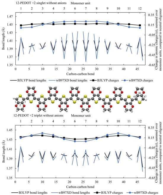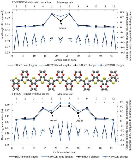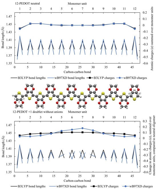 For the 12-PEDOT +1 doublet without anions, there is a pronounced difference between the two functionals. The bond lengths of wB97XD show a quinoid region localised over two monomer units with a sharp transition on the monomer units either side. In contrast, B3LYP predicts that the difference between short and long bond lengths slightly reduces. This is a key difference between the two functionals, with B3LYP tending towards a delocalisation of distortions along the whole oligomer in PEDOT without anions while wB97XD results in strongly localized distortions. This has also been shown elsewhere as previously discussed []. The charges follow the distortion location: wB97XD consequently has a charge peak around the middle of the oligomer. The slight asymmetry in summed charges is attributed to a rounding error in the partial charge calculation.
