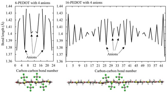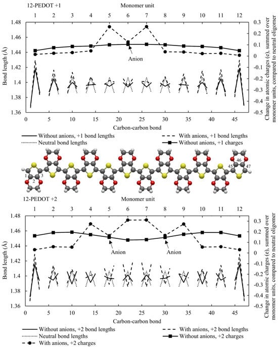 As observed for 12-PEDOT without anions in Figure 3, there are two general forms of distortion that appear in the PEDOT systems studied in this work: a single or double peak distortion. It is found here that both can occur for PEDOT systems with anions as well. Figure 5 shows that for 12-PEDOT with anions, a single peak distortion occurs for one and two anions, noting that the charge density exhibits a dip on the monomer unit where the anion is located, with no accompanying change in the bond lengths. This is attributed to DFT incorrectly calculating the anions as having less than -1e charge. This single peak distortion observed is a similar result to that presented by Sahalianov et al. who found that two counterions a relatively short distance apart would cause a single peak distortion with singlet ground state, which they referred to as a bipolaron, whereas two anions further apart could induce a double peak distortion with triplet ground state, which they termed a polaron pair []. The possibility of a polaron pair in this definition is not explored here; to observe it, Sahalianov et al. used an 18-oligomer, longer than is explored in this work.
