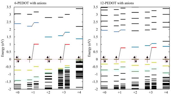 The energy level diagrams corresponding to the PEDOT with and without anions in Figure 7 and Figure 8, respectively, are very similar in character, showing that the oxidation level of the PEDOT rather than the position or presence of anions is the dominant influence on the energy level structure. As seen in other work [], the states ‘appearing’ in the gap are not new states created by the introduction of anions but occur in PEDOT oxidized both without anions and with anions. In fact, these states are the newly unoccupied HOMO being pushed upwards, whether that is the unoccupied half of a half-occupied HOMO, or a spin-symmetric new LUMO. It is the pushing up in energy of the newly unoccupied levels that causes the bandgap to be reduced.