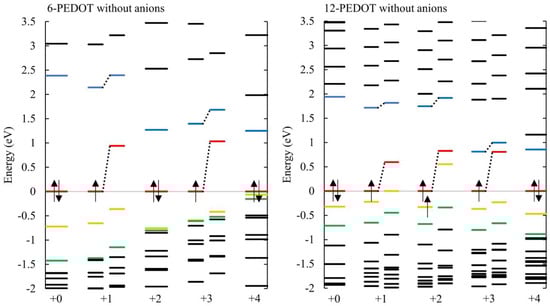 Energy levels for 6-PEDOT and 12-PEDOT, without counterions, at different oxidation states. It is shown that for odd charges, with doublet ground state, a single unoccupied layer appears in the gap, which is the unoccupied β orbital of the HOMO. For 12-PEDOT, the patterns are similar, but the HOMO–LUMO gap reduces faster for longer chain lengths. For the +2 state, which has triplet ground state, two unoccupied levels appear in the gap; these are the unoccupied β orbitals of the two singly occupied orbitals. The HOMOs are normalized to 0 eV. Without this normalization, the overall energy level scale reduces as electrons are removed.