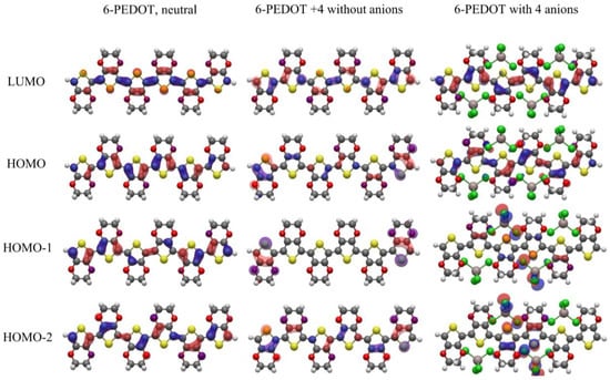 A key difference between Figure 7 and Figure 8 is observed at high anion concentrations in Figure 7, where an anion concentration of 0.66 is reached for 6-PEDOT +4. In this case, many energy levels cluster closely under the HOMO. This is caused by Coulombic repulsion between the anions, which causes their orbitals to rise in energy. This result can also be seen in [], although it is not discussed. These orbitals are highly localized on the chlorine atoms of the anions, as shown in the HOMO to HOMO-2 of 6-PEDOT with four anions in Figure 9. Due to their high localisation, the anionic chlorine orbitals have very similar energies to each other, hence the close stacking of their energy levels in Figure 7. This effect occurs further down the energy scale for 12-PEDOT with anions, because the overall anion concentration is only 0.33 instead of 0.66. This reduces the Coulombic repulsion between the anions and lowers the energy of their orbitals. It is noted that the existence of high levels of Coulombic repulsion is contradictory to the bipolaron model, which predicts that the structural energy savings of co-locating anions could overcome the Coulombic repulsion. Instead, a decrease in anion location stability is observed as discussed in [].