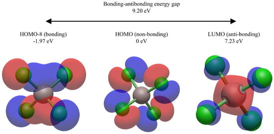 In order to understand the nature of the states introduced by co-located anions, the anion was studied in isolation. AlCl4− has a wide energy gap between its bonding and antibonding states (9.2 eV). When co-located with the PEDOT, the antibonding states sit at high energy, well above the HOMO–LUMO gap of the overall system as shown in Figure 8, while the bonding states sit at low energy, well below the gap. When the anion is considered in isolation, there are eight p-derived non-bonding states on the AlCl4− anion from HOMO to HOMO-7. The bonding, non-bonding and antibonding states are shown in Figure 9. All of the non-bonding states are chlorine p-orbitals of similar character to the anionic HOMO. It is clear from comparing Figure 9 and Figure 10 that the anionic orbitals appearing in the HOMO-1 and HOMO-2 for 6-PEDOT with four anions have the character of the anionic non-bonding orbitals. None of the anionic orbitals contribute to unoccupied energy levels appearing in the gap as the number of anions increases, in contrast to the predictions of the bipolaron model [].