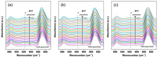 FTIR spectra in the wavenumber range of 970–850 cm−1 for PLLA films treated under CO2 at different pressures and 0 °C for different treatment times (tt): (a) 2.0, (b) 1.8, and (c) 1.6 MPa.