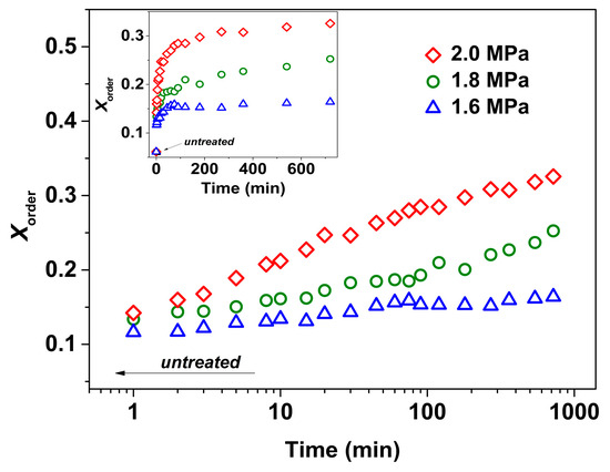 Evolution of mesophase fraction (Xorder) (calculated from the spectra in Figure 2) as a function of treatment times (tt) for PLLA films treated under CO2 at different pressures and 0 °C. The inset shows the Xorder versus the linear tt. Integrated area of A917 and A956 were calculated based on baselines of 932–905 and 967–938 cm−1 around the 917 and 956 cm−1 bands, respectively.