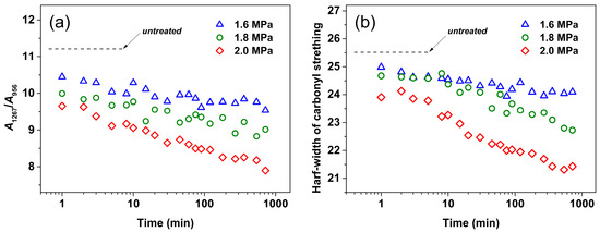 (a) Intensity ratio A1267/A956 and (b) evolution of half-width of the carbonyl stretching region (1820–1700 cm−1) as a function of treatment time (tt) for PLLA films treated under CO2 at different pressures and 0 °C. Integrated area of A1267 and A956 were calculated based on baselines of 1287–1252 and 967–938 cm−1 around the 1267 and 956 cm−1 bands, respectively.