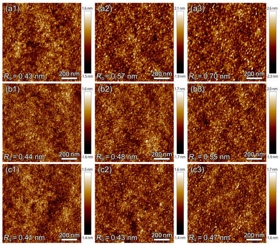 AFM height images for PLLA films treated under CO2 at different pressures of (a1–a3) 2.0, (b1–b3) 1.8, and (c1–c3) 1.6 MPa and 0 °C for different treatment times (tt) of (a1–c1) 3, (a2–c2) 30, and (a3–c3) 300 min.