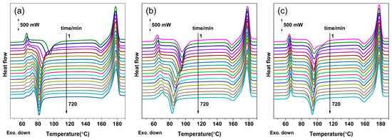 As seen in Figure 6, because of the ultra-high nucleation density of the structural ordering, the sample is considered to be approximately divided into numerous nanoscale regions. The sample can be composed of granular intermediate ordered structures (mesophase) with varying degrees of order, which is strongly dependent on the tt. Thus, the degree of order and structural evolution of the mesophase during the formation process under various treatment conditions (i.e., tt and pressure) can be further understood by studying the ensemble thermal behavior. As shown in Figure 7, the DSC heating curves exhibit multiple thermal transition signals, in particular the enthalpy recovery, endothermic peak (Tg, post) near the glass transition, and cold crystallization corresponding to the peak temperature of Tc, depending on the treatment conditions.