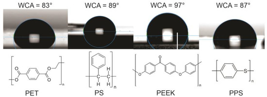 In this paper, we focus on frequently used aromatic polymers such as polyethylene terephthalate (PET), polystyrene (PS), polyether ether ketone (PEEK), and polyphenylene sulfide (PPS). The structural formulae of these polymers are shown in Figure 1. The selected polymers differ in their chemical composition—PS is a pure hydrocarbon polymer, PET and PEEK contain oxygen, and PPS contains sulfur. The measured values of WCA for these non-treated polymers are also stated in Figure 1. The values reported in the literature by specific authors may differ by 10° or even more, which could be explained either by the accuracy of the device used for measuring the water contact angle, any surface impurities, different surface morphology, purity, and crystallinity, or a combination of these effects. We measured the WCA for all four aromatic polymers, and the water droplets for untreated polymer samples used in this study are shown in Figure 1.