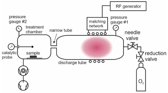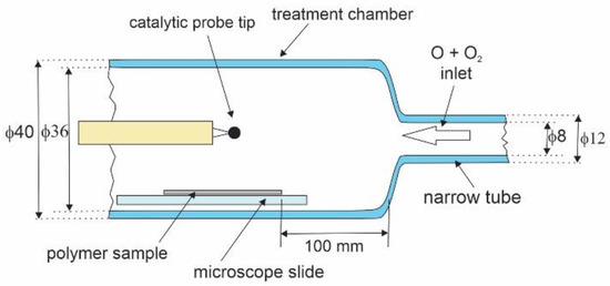 The treatment chamber is shown in Figure 3. It was made from borosilicate glass and kept at room temperature. The inner diameter of the treatment chamber tube was 36 mm, and of the narrow tube, it was 8 mm. The tip of the catalytic probe was placed about 1 cm above the sample, as shown in Figure 3. The probe was movable, so we could measure the gradient of O-atom density along the treatment chamber by moving the position of the probe tip from one side to the other side of the polymer sample. The gradients were marginal as the O-atom density at the position above the sample edge facing the inlet from the narrow tube was, at most, by a factor of 1.1 higher than at the position above the sample edge facing the pump duct. The 10% is below the inaccuracy of the catalytic probe (as mentioned above, it is around 20%), so the O-atom density during the treatment of the polymer samples was measured at a fixed position of the catalytic probe tip, as shown in Figure 3.