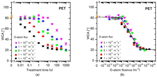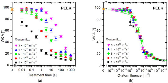 The first observation in Figure 4a is that the WCA remains intact at low fluxes and reasonably large treatment times. For example, the WCA remains unchanged up to the treatment time of a second at the lowest flux of 3 × 1020 m−2s−1. As values of either of these variables are increased, the WCA decreases with increasing treatment time, but huge differences are observed between different fluxes of O-atoms. For example, a few seconds of treatment at a flux of 1 × 1023 m−2s−1 causes saturation in the wettability of PET samples (reaching a constant WCA of approximately 20°), while the hydrophobic character remains intact (the WCA is the same as for the untreated samples, i.e., approximately 80°) at a flux of 3 × 1020 m−2s−1. It is obvious that a certain WCA can be achieved practically at any treatment time, so the treatment time is not the parameter that governs the surface wettability.