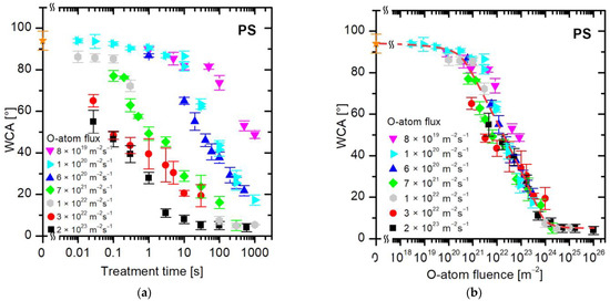 Similar results as for PET (Figure 4) were also obtained for polystyrene (PS). Figure 5 shows the evolution of the WCA for PS samples, where the WCA in Figure 5a is plotted versus the treatment time and in Figure 5b versus the dose of O atoms. The results are similar to those observed for PET, except that the initial WCA is larger and the final is smaller. In fact, the final WCA is close to the detection limit of our method, which is a few degrees. The treatment of PS by oxygen atoms at fluences larger than approximately 2 × 1024 m−2 enables an almost super-hydrophilic surface finish (Figure 5b).