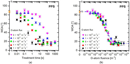 Figure 7 shows the evolution of wettability for a sulfur-containing polymer, PPS. Again, the values of WCA versus the treatment time (Figure 7a) are scattered, so the treatment time does not tell much about the surface finish. Figure 7b is a plot of measured WCA versus the fluence of oxygen atoms. The curve in Figure 7b is similar for other polymers (Figure 4b, Figure 5b and Figure 6b), so the evolution of surface wettability of this aromatic polymer containing sulfur follows the same trend: the WCA remains intact up to the O-atom fluence of approximately 1020 m−2, decreases rapidly in the range between 1021 and 1023 m−2, and stabilizes thereafter.
