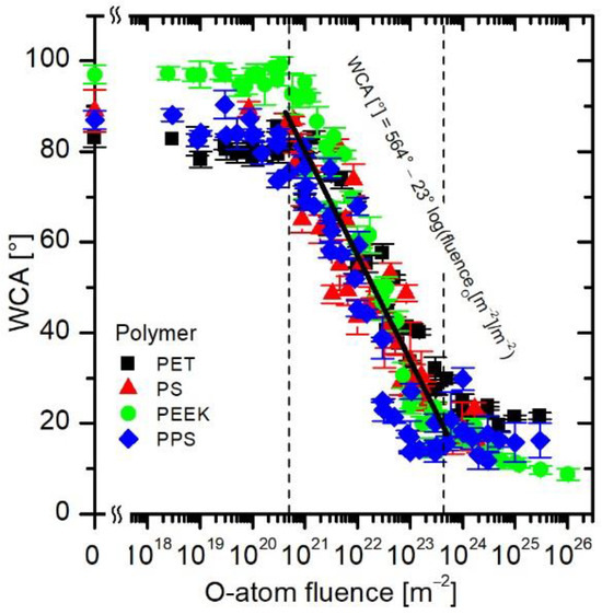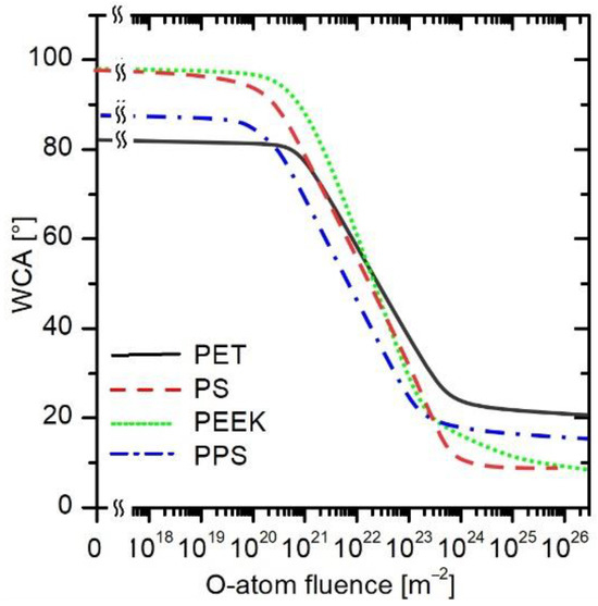 Between the O-atom fluence of 5 × 1020 and 5 × 1023 m−2, the WCA decreases fairly linearly in Figure 8. Considering the logarithmic scale on the x-axis, the general curve deduced from Figure 8 follows the exponential decrease in the WCA. The exponential decrease is typical for approaching a saturated state of matter. In the case of wettability, the saturation is attributed to the formation of a layer of polar functional groups on the polymer surface [40].