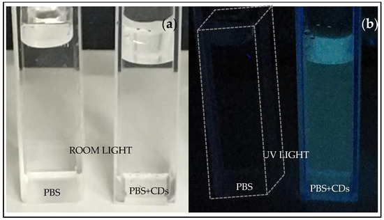 Figure 2 shows cuvettes containing PBS and PBS+CDs, both illuminated by room light (see Figure 2a) and illuminated by UV light at 365 nm wavelength (see Figure 2b). The suspension of PBS+CDs lights up in a blue color under UV light, suggesting emission at a wavelength of 450–495 nm. The cuvette containing PBS is barely perceivable under UV illumination (indeed, it was necessary to draw a dotted white line to mark the edge of the cuvette containing PBS in Figure 2b). Finally, 1.5 mL PVA was mixed with the CDs solutions for 5 min using a magnetic stirrer. The obtained PVA+CDs mixed liquid was poured into a Petri dish, followed by exposure under a Herolab UV lamp (Herolab GmbH Laborgerate, Wiesloch, Germany), operating at 365 nm wavelength for 150 min. The cast films were peeled off from the Petri dish and placed in a desiccator to avoid the effects of water in the air on the hydrophilic PVA.