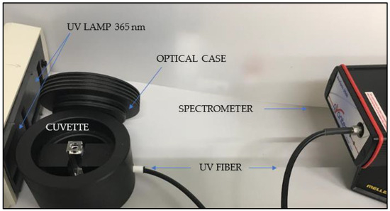 The luminescence of PVA+CDs was investigated using an Ava Spec 2048 spectrometer with a spectral resolution of about 1 nm. A case shown in Figure 3 hosts a quartz cuvette illuminated by a Herolab UV lamp operating at a fluence of 37.5 mJ/cm2 and a wavelength of 365 nm while a UV fiber connected to the spectrometer is located at 180° with respect to the lamp.
