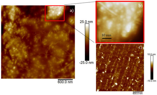 The surface of the charcoal target used for the production of CDs was about 6.25 cm2, with a thickness of 5 mm and a mass of about 0.848 g before the laser irradiation and about 0.835 g after 30 min of laser processing. Assuming all ablated carbon atoms transformed into C-dots, and assuming the size of the CDs was about 10 nm, using the measured density of the used charcoal of about 0.271 g/cm3, the number of carbon dots generated by laser ablation should be about 8.8 × 1016/cm3. Figure 4 presents the image of a cut of a silicon wafer covered with a layer of CDs suspension dried in air (see Figure 4a). The reported size of the structures in the area marked in red is about 4 nm (see Figure 4b). This area is representative of the investigated areas in the whole sample.
