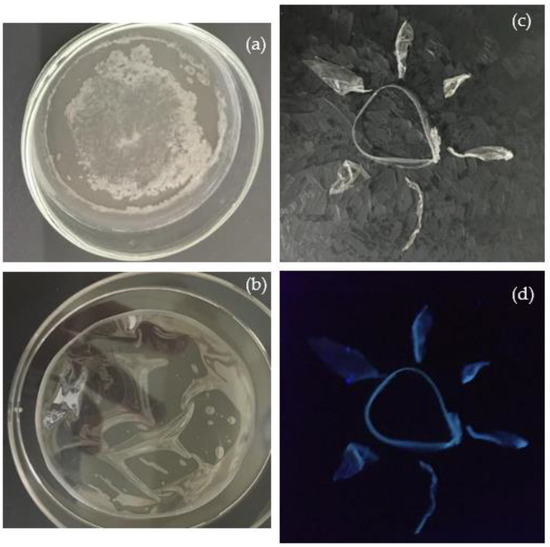 Figure 5 displays PVA foils dried under room light (see Figure 5a) and under UV light at a wavelength of 365 nm (see Figure 5b). PVA is a linear synthetic polymer consisting of a high number of hydroxyl groups in its molecular chains, affecting the chemical and physical properties of PVA. The expected properties of PVA are hydrophilicity, solubility, biocompatibility, non-toxicity, and transparency.