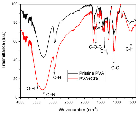 FTIR spectrum for pristine PVA and PVA+CDs foil.