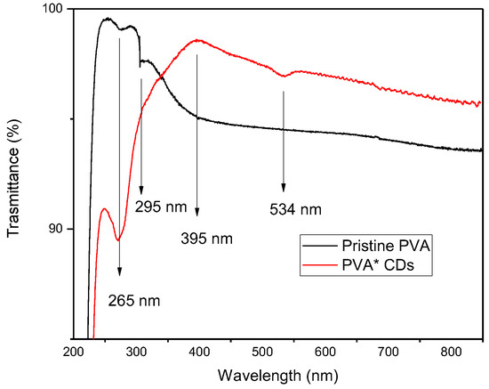 Figure 7 compares the optical transmittance of pristine PVA and the PVA+CDs composite. The transmittance is complementary to that of the absorption spectrum. PVA is colorless, without any absorption in the visible range. However, the absorption of PVA that can be observed at about 265 nm is assigned to the electronic transitions π→π* of aromatic sp2 domains [39] of the conjugated C=C bonds concomitant with a carbon core of CDs and to the n → π* transitions of C=O and COOH groups [35]. The peak around 395 nm could be attributed to the existence of n→π* from C=O.