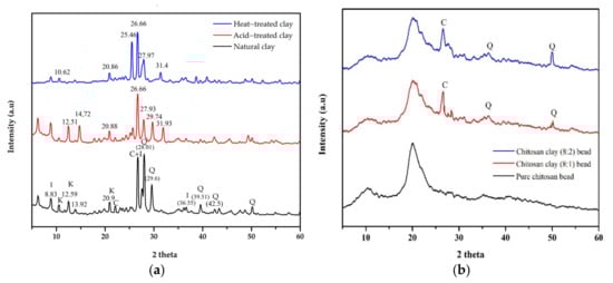 XRD pattern: (a) natural and treated clay; (b) pure chitosan bead and composite bead [I—illite, K—kaolinite, C—calcite and Q—quartz].