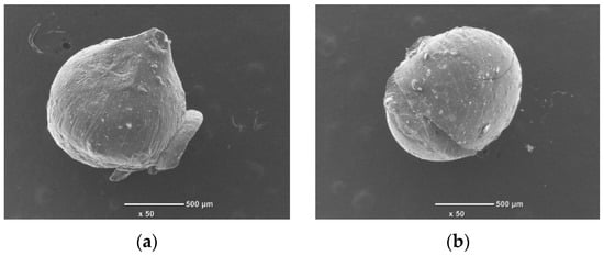 It can be seen that the surface of the pure chitosan bead, with an average diameter of 1.1–1.2 mm, has a uniform texture and is smooth, whereas the surfaces of the composite beads were not smooth due to structural changes. The SEM images of the composite beads loaded with Cr(III) and Cr(VI) after adsorption are compared in Figure 3.