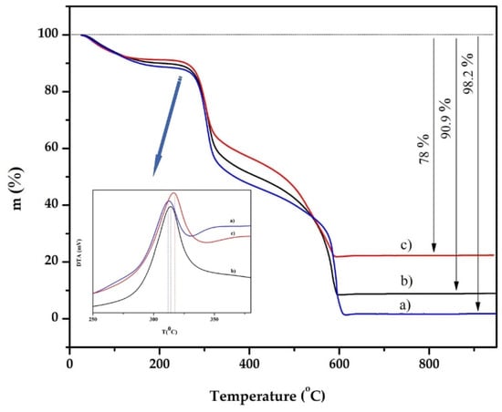 The composite materials were characterized using thermogravimetric (TG) analysis. The TG and DTA curves are shown in Figure 4.
