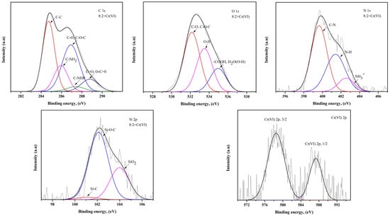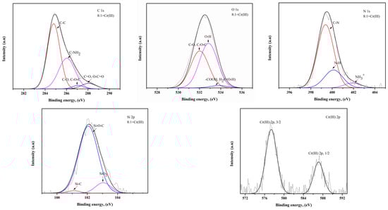 However, the high content of ions in the 8:2 composite bead is attributed to the fact that , or the amino group in chitosan, is protonated and converted into in the acidic environment during adsorption [31]. In regard to Si in the adsorbent, Si–O–C bonds are dominant, suggesting that carbon atoms are connected to silicon through oxygen bridges during the interaction between the chitosan and treated clay. The Si–O–C bonds in the 8:1 composite bead are greater in number than those of the 8:2 composite bead, which indicates that when the amount of chitosan in the adsorbent is high, there is a sufficient amount of carbon atoms to bond with the silicon in the treated clay [32]. However, the high SiO2 content in the 8:2 composite bead indicates that as the amount of treated clay in the adsorbent increases, more silicon atoms have not yet participated in the bonding. The XPS analysis shows that the chromium ions are adsorbed in their original form, Cr(III) and Cr(VI), respectively, without undergoing oxidation or reduction reactions. When Cr(III) and Cr(VI) were adsorbed on the composite bead, Cr(III) could be associated with the hydroxyl group of the adsorbent, while Cr(VI) was associated with an amino group of the composite bead [4].