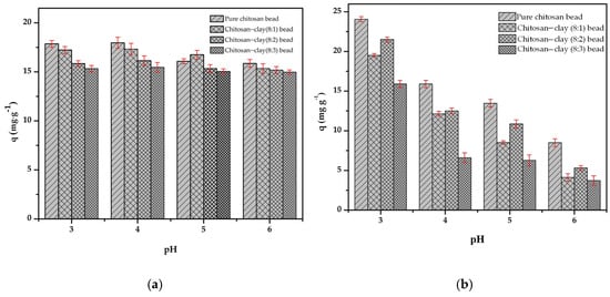 We conducted the adsorption experiment in the pH range of 3–6, because the chitosan bead decomposes when the pH is less than 2. In an aqueous solution, the dominant ions for Cr(III) and Cr(VI) are Cr3+ and НCrO4−, respectively [33]. The adsorption capacity of the composite beads prepared from a mixture of chitosan and treated clay with a mass ratio of 8:1, 8:2 and 8:3 were compared with the bead prepared from pure chitosan. Figure 7a,b shows the dependence of the pH on the Cr(III) and Cr(VI) adsorption amount by the synthesized adsorbents and the dependence of the mass ratio of chitosan/clay for the same pH condition. In the pH range of 3–6, the dependence of the pH on the Cr(III) adsorption amount by the adsorbent is smaller than that of Cr(VI).