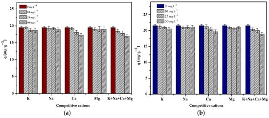 Effect of competitive cations on the adsorption capacity: (a) Cr(III) and (b) Cr(VI) onto chitosan bead and chitosan–clay composite bead (pH = 4 and 3, t = 240 and 180 min, T = 298 K, C0 = 50 mg·L−1, V = 50 mL, m = 0.1 g, n = 100 rpm).