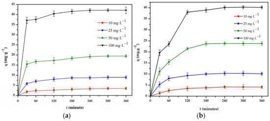 The experiments for the kinetic study were carried out at 298 K. Based on the results of the previous experiment, the pH of the solutions was adjusted to 4 and 3 for the Cr(III) and Cr(VI) solutions, respectively (Figure 9).