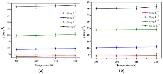 Usually, in adsorption thermodynamic studies, the temperature value is chosen between 328 K and 338 K. In our case, the adsorption experiment was carried out in the temperature range of 298–328 K. Figure 10 shows that the adsorption capacity increases slightly as the temperature increases. This can be explained as an increase in the adsorption capacity due to an increase in the adsorbate (Cr(III) or Cr(VI)) migration rate and, consequently, an increase in the number of collisions effective for adsorption as the temperature increases [38].