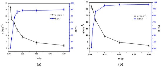 Effect of adsorbent mass on the adsorption of: (a) Cr(III) onto chitosan and clay (8:1) bead and (b) Cr(VI) onto chitosan and clay (8:2) bead (pH = 4 and 3, t = 240 and 180 min, T = 298 K, C0 = 50 mg·L−1, V = 50 mL, n = 100 rpm).