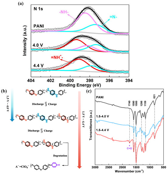(a) N1s XPS spectrum of the PANI film electrode at its initial state, 4.0 V and 4.4 V (the red line: =NH+–; the purple line: –NH–; the blue line: =N–); (b) schematic illustration of reversible redox reactions between different PANI forms and PANI degradation during the electrochemical process at high potential; (c) FTIR of the as-prepared PANI and PANI electrodes after 50 GCD cycles in different potential ranges.