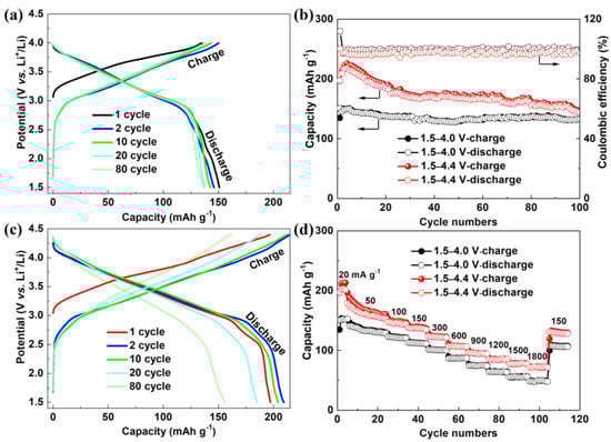 Further elevating cut-off potentials in excess of 4.4 V (Figure 2d), we can observe continuously increased charge capacities to 326.7 and 479.4 mAh g−1 at 4.6 and 4.8 V, respectively, much higher than that obtained at 1.5–4.4 V. But the discharge capacities are almost equal at the three cut-off potentials. The extra charge capacities mainly derive from the irreversible decomposition of the organic electrolyte at potentials higher than 4.4 V [30,31]. Therefore, the upper cut-off potential is set as 4.4 V concerning the trade-off between capacity and reversibility.